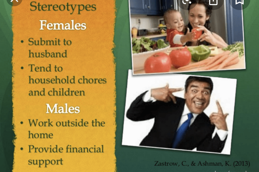 | – male dominance – sexism – Women cook/ Care for children | – men work outside (agriculture) – Women in charge of household |